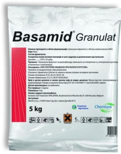 ali apna. Pri razkuževanju se proizvod enakomerno razporedi po površini tal (s trosilnikom, ročno) in takoj vdela do želene globine, nato se površina poravna ali rahlo povalja. Za zagotovitev zadostne vlažnosti tal 3-5 dni po nanosu se suha tla škropijo, dokler se ne doseže potrebna vlažnost. Da bi to ohranili in povečali učinkovitost zdravila Basamid, je priporočljivo obdelano površino za 5-7 dni pokriti s ponjavo, plastično folijo itd.