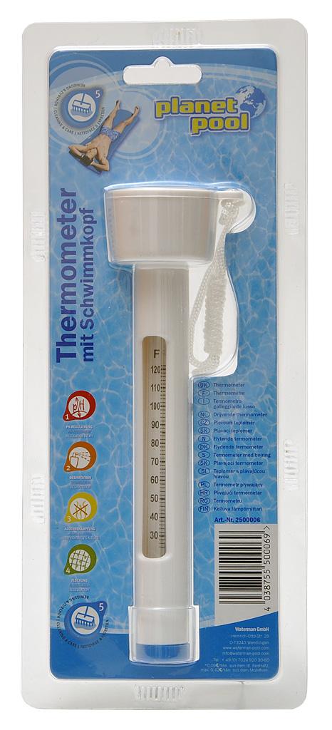 Preprost in zanesljiv termometer, namenjen merjenju temperature vode v plavalnih bazenih. Termometer vključuje plovec, ki ohranja termometer na gladini v pravilnem položaju. Termometru je priložena tudi vrvica za pritrditev termometra na rob bazena.