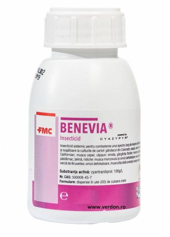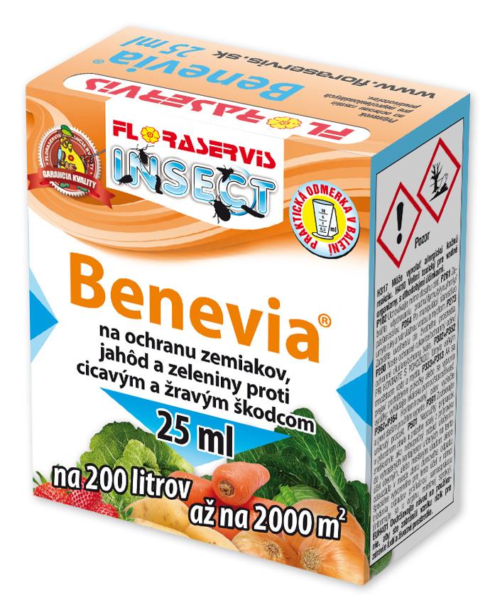 Insekticid za škropljenje v obliki koncentrirane suspenzije na oljni osnovi (OD) za zaščito krompirja, jagod in zelenjave pred korozivnimi škodljivci in škodljivci sesalcev.benevia® vsebuje cianraniliprol, kontaktni in požarni insekticid iz skupine anthranildiamidov z novim mehanizmom delovanja (IRAC skupina 28). Benevia® aktivira rianodinske receptorje ciljne žuželke, blokira mišično regulacijo ter povzroči hitro paralizo in smrtnost. Izpostavljenost toksičnemu odmerku povzroči takojšnje prenehanje hranjenja (v nekaj urah po tretiranju) zaradi paralize, popoln pogin pa nastopi v 3-6 dneh po uporabi. Benevia® je oviviciden in ovi-larviciden ter uniči vse ličinke in odrasle osebke dovzetnih vrst žuželk. Hiter začetek delovanja pomeni odlično zaščito pridelka pred poškodbami. Benevia® deluje zlasti na mrhe, molje, trips, gosenice metuljev in nekatere hrošče.