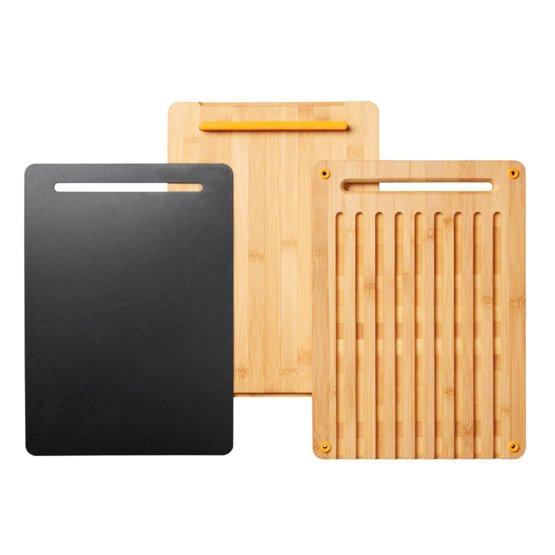 Komplet bambusovih lopatic za rezanje Fiskars Functional Form™ vsebuje 2 debeli bambusovi lopatici in eno zamenljivo plastično desko za rezanje Bambusova lopata z žlebovi je idealna za rezanje kruha in peciva. V žlebovih se ujamejo drobtine, ki nastanejo pri rezanju. Lopatice imajo nedrseče silikonske nogice.