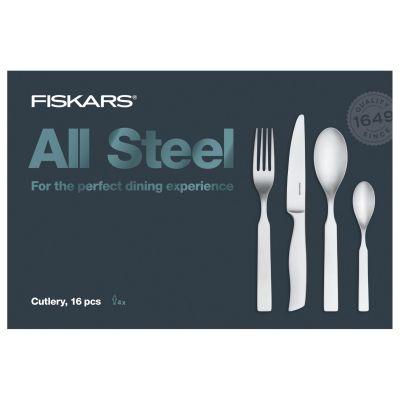Fiskarsov jedilni pribor je izdelan iz visokokakovostnega nerjavečega jekla v tovarni na Finskem. 16-delni komplet vilic, nožev, žlic in žličk v modernem dizajnu je namenjen 4 osebam.