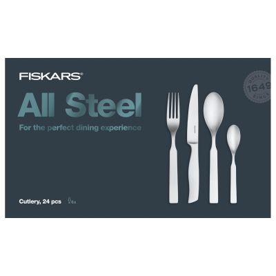 - Vsebina 24-delnega kompleta jedilnega pribora Fiskars All Steel: