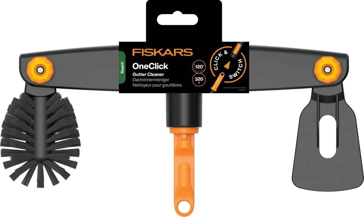 Čistilec žlebov Fiskars OneClick je zasnovan za učinkovito vzdrževanje strešnih žlebov neposredno s tal. Združuje strgalo za odstranjevanje grobih in zasušenih nečistoč ter zaobljeno krtačo za končno čiščenje. Zahvaljujoč nastavljivemu kotu delovne glave in teleskopskemu ročaju OneClick boste žlebe očistili hitro in brez tveganja, povezanega z delom na lestvi.