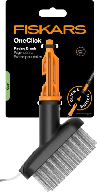 Krtača za fuge Fiskars OneClick je zasnovana za enostavno odstranjevanje mahu, plevela in umazanije iz ozkih prostorov med ploščicami in tlakovci.