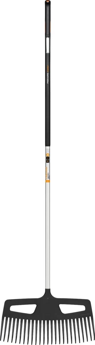 Široka grablja z elastičnimi prsti za učinkovito grabljenje listja na velikih površinah. Trpežno in hkrati lahko držalo iz utrjenega aluminija za enostavno čiščenje vrta brez nepotrebnega napora. Držalo z udobno površino iz materiala Softgrip™ na mestu prijema. Praktična odprtina za shranjevanje