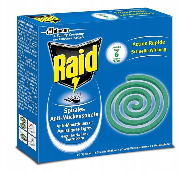 Spiralni repelent proti komarjem Raid, paket vsebuje 10 kosov + praktično stojalo. Insekticidne spirale proti komarjem vas bodo varno ščitile do 8 ur, posebej so zasnovane za domačo uporabo. Enostavno jih je uporabljati. Ne ugasne niti ob rahlem vetru. Porabi se po potrebi. učinkovita je tudi na vrtovih, terasah, balkonih ali pri kampiranju. Ena spirala ščiti do 10 m2 tudi v vetru, le zelo močan veter lahko zmanjša njen učinek.