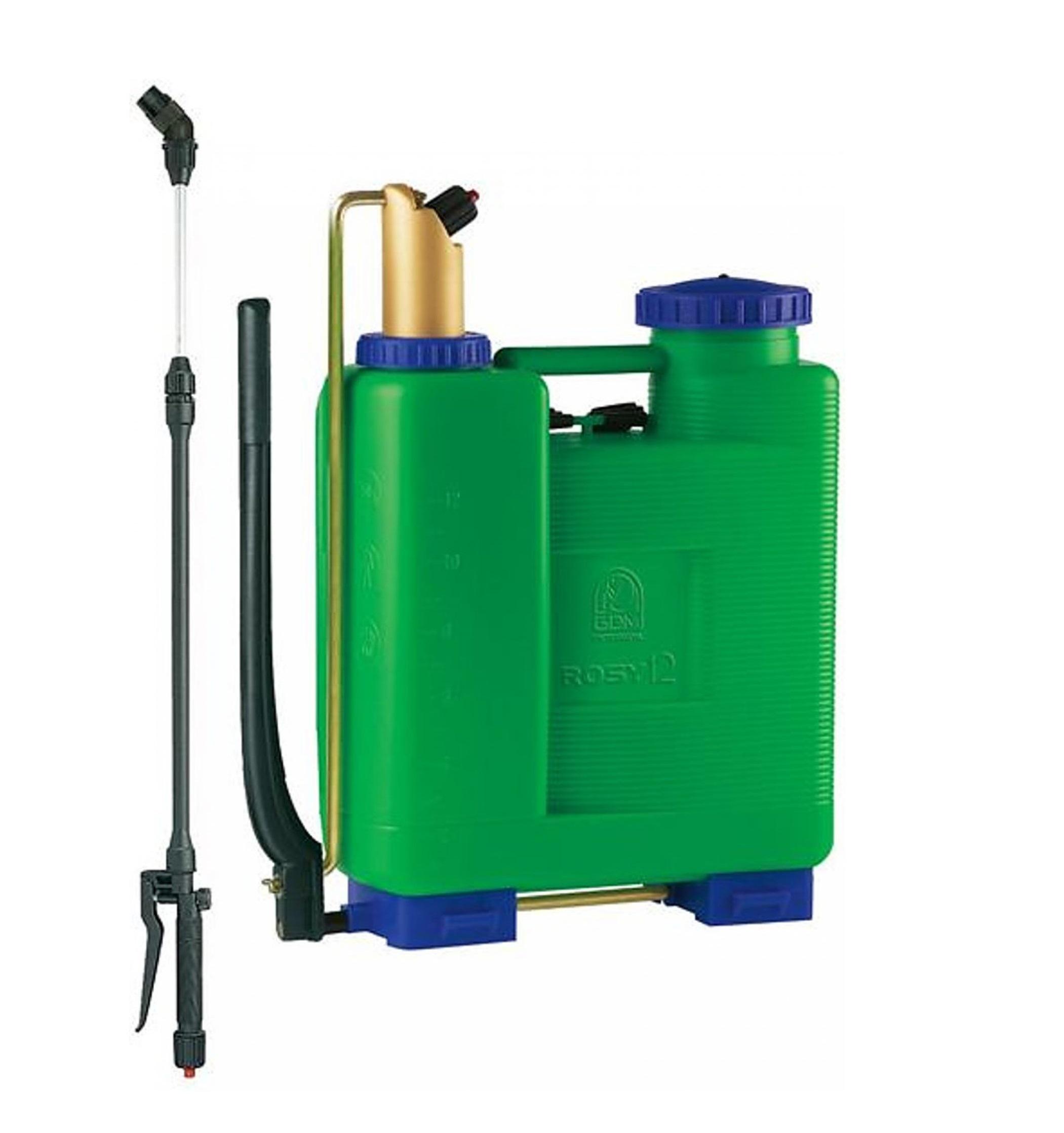 Razpršilnik profesionalne kakovosti 12 L. Primeren za večje površine. Udobno potiskanje, ko je obešen na hrbtu. Vključuje teleskopski podaljšek z največjim razponom 110 cm in dva konca šobe, ploščatega in stožčastega. Ker je izdelan iz plastike, je zelo lahek. Primeren za desničarje in levičarje. Črpa se s črpanjem vzvodov, ne da bi bilo treba razpršilnik zložiti s hrbtne strani.