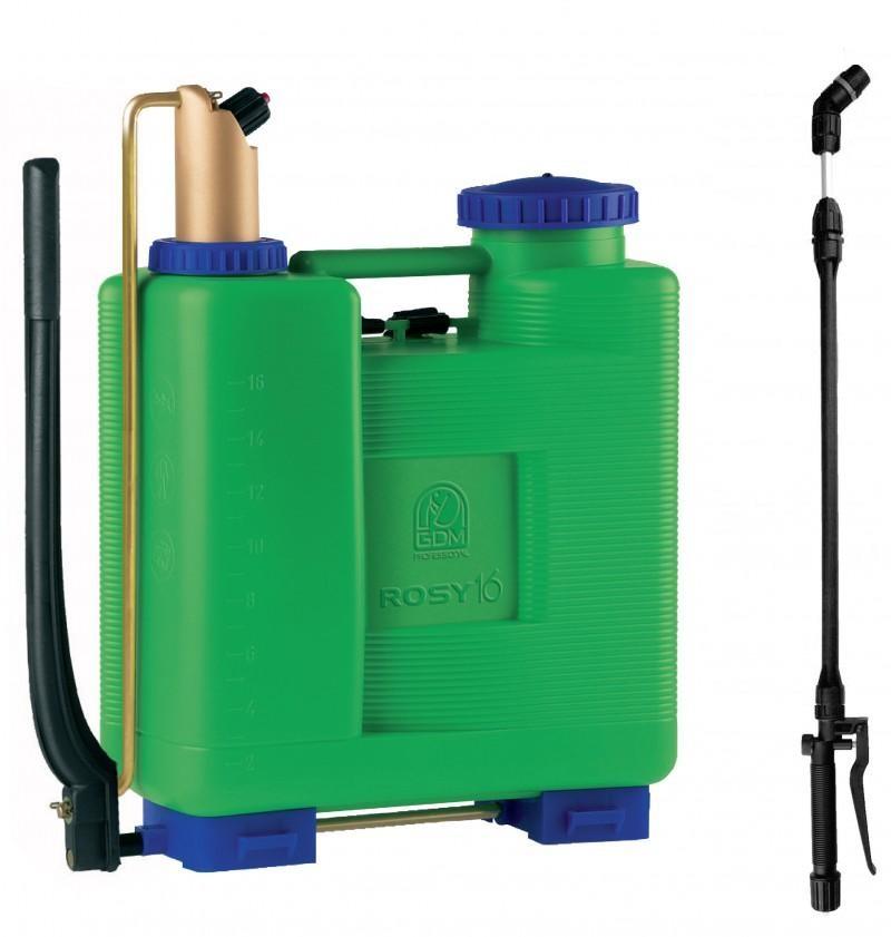 Razpršilnik profesionalne kakovosti 16 L. Primeren za večje površine. Udobno potiskanje, ko je obešena na hrbtu. Vključuje teleskopski podaljšek z največjim razponom 110 cm in dva konca šobe, ploščatega in stožčastega. Ker je izdelan iz plastike, je zelo lahek. Primeren za desničarje in levičarje. Črpa se s črpanjem vzvodov, ne da bi bilo treba razpršilnik zložiti s hrbtne strani.
